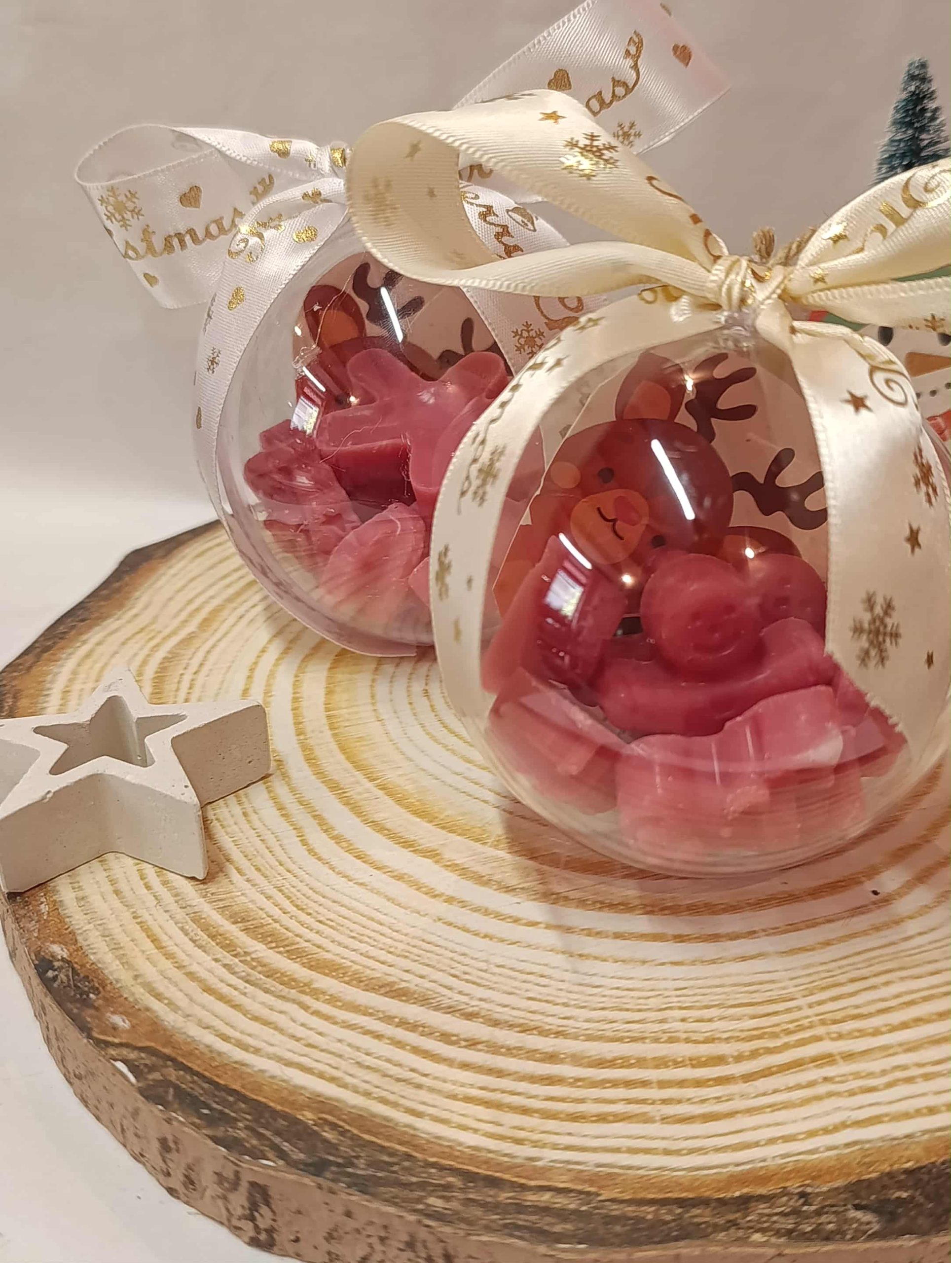 Xριστουγεννιάτικο στολίδι διάφανη μπάλα 8cm με εφτά wax melts,  διακοσμημένη με υπέροχο μεγάλο χριστουγεννιάτικο φιόγκο κρεμ ή μπεζ με χρυσές λεπτομέρειες  αλλά και σπάγγο, έτοιμο για να κρεμαστεί στο δέντρο μας!!