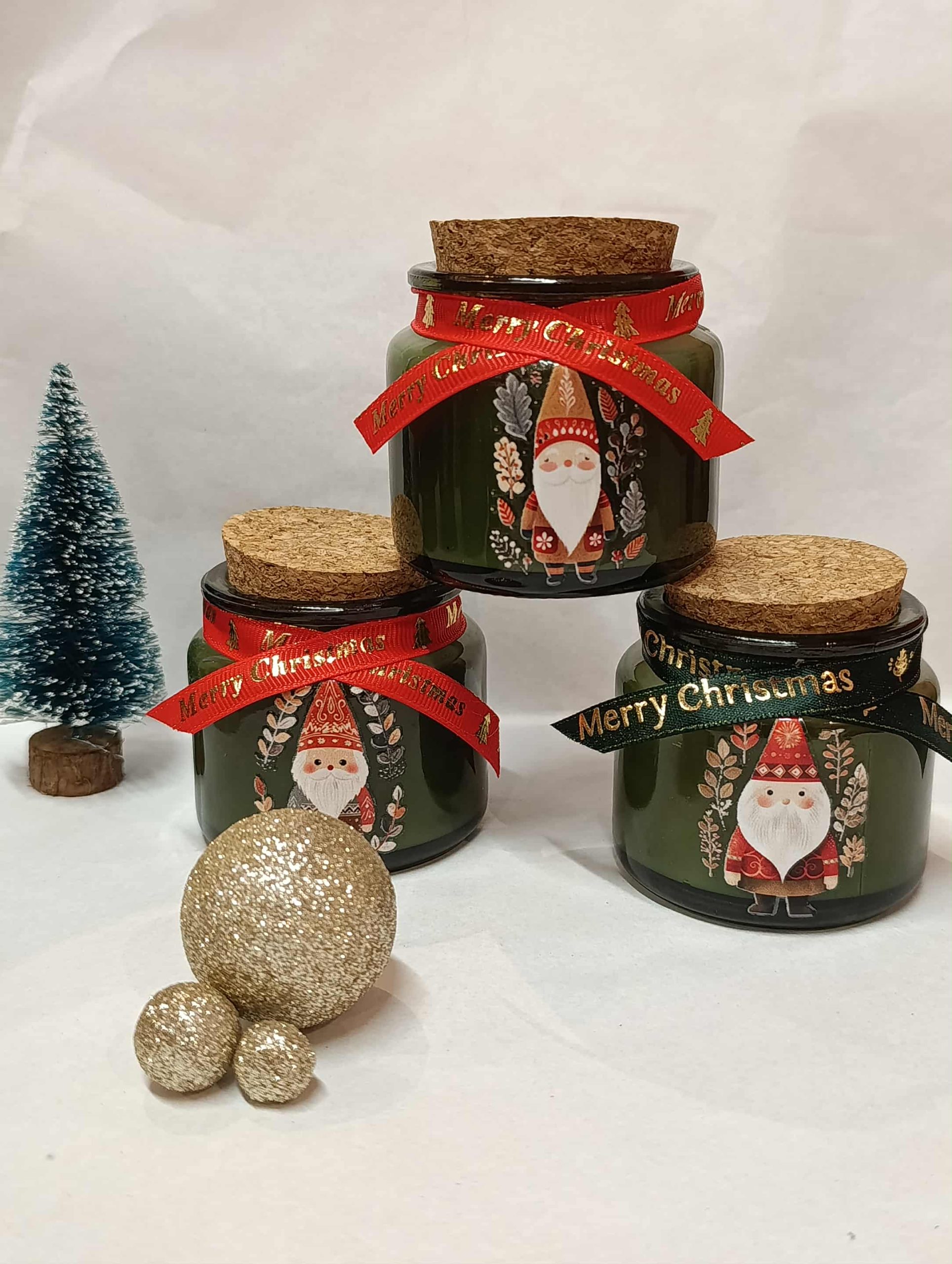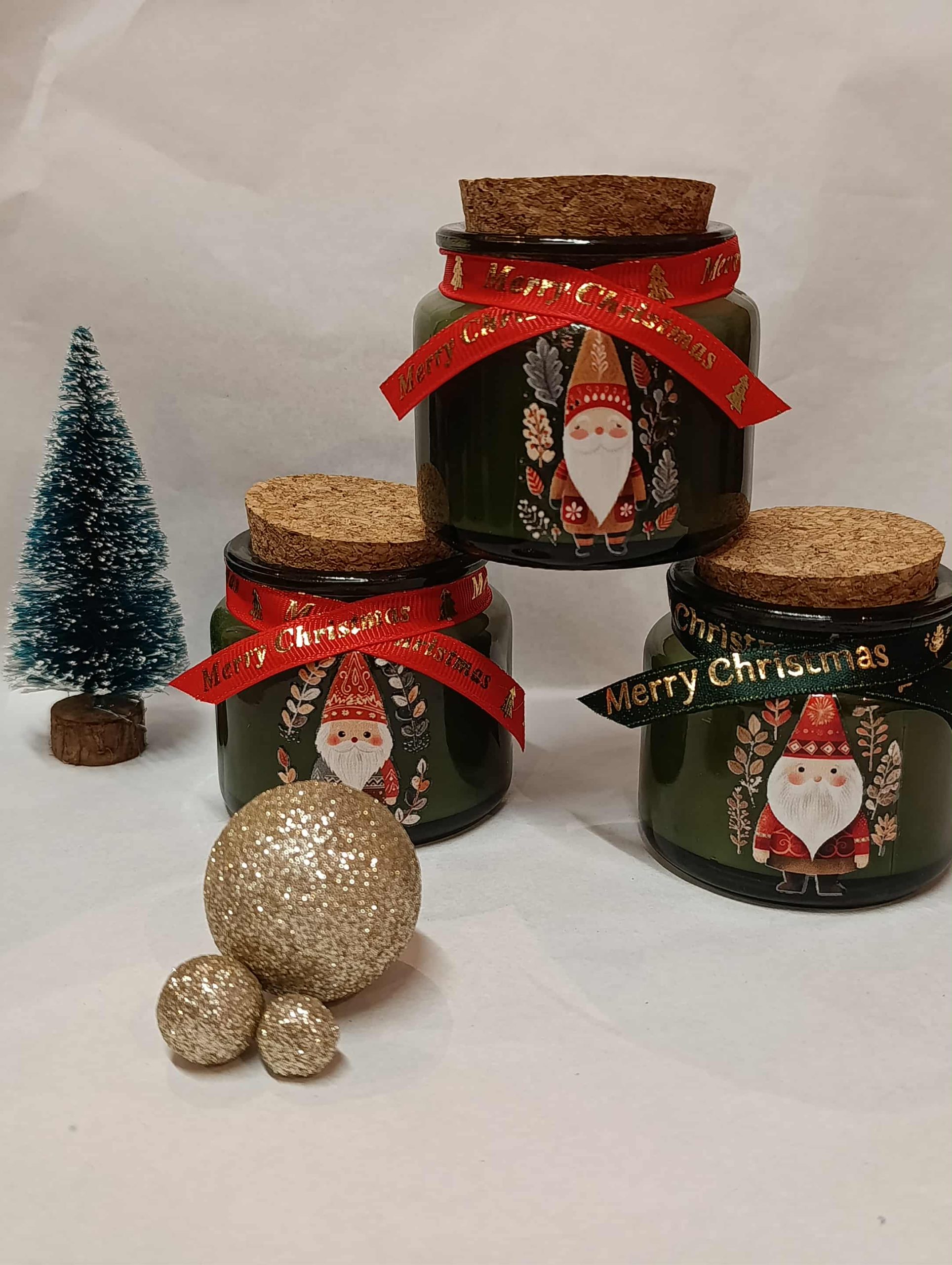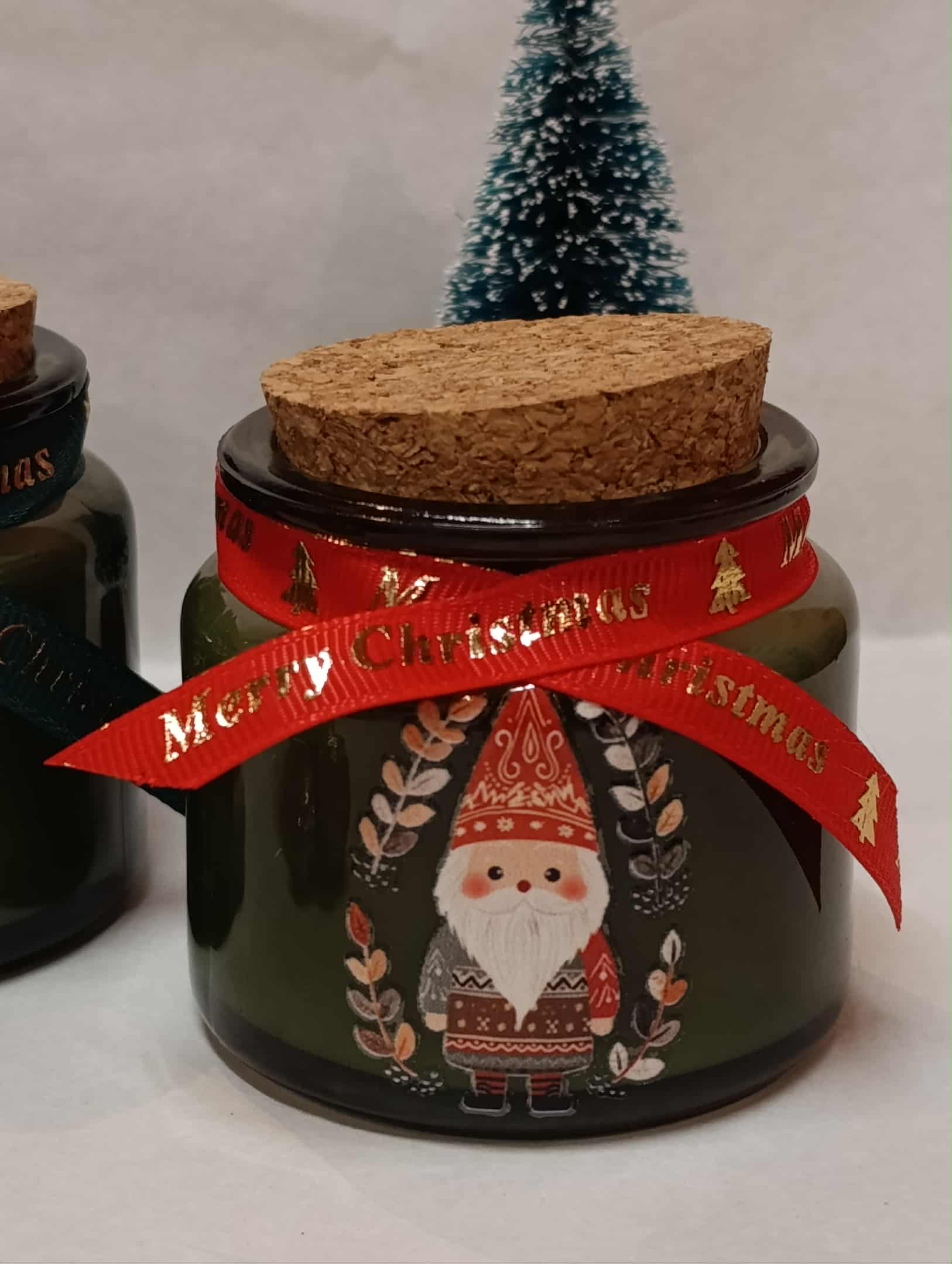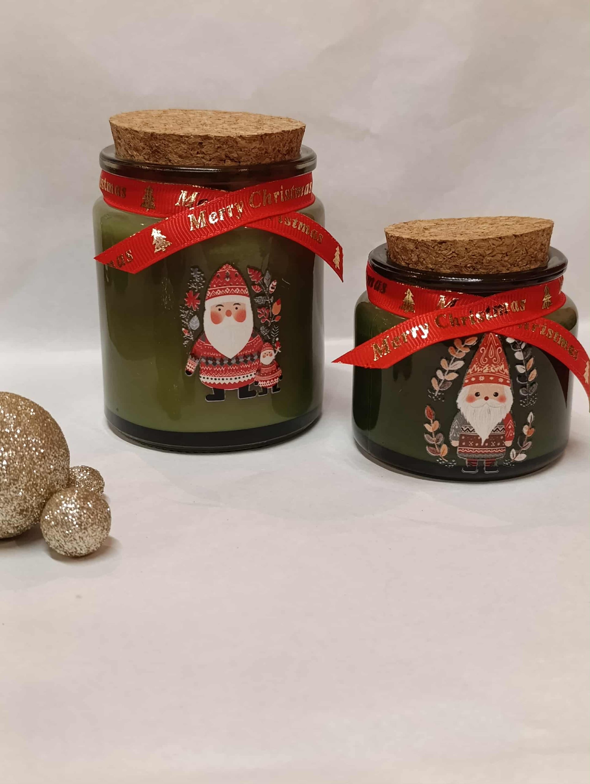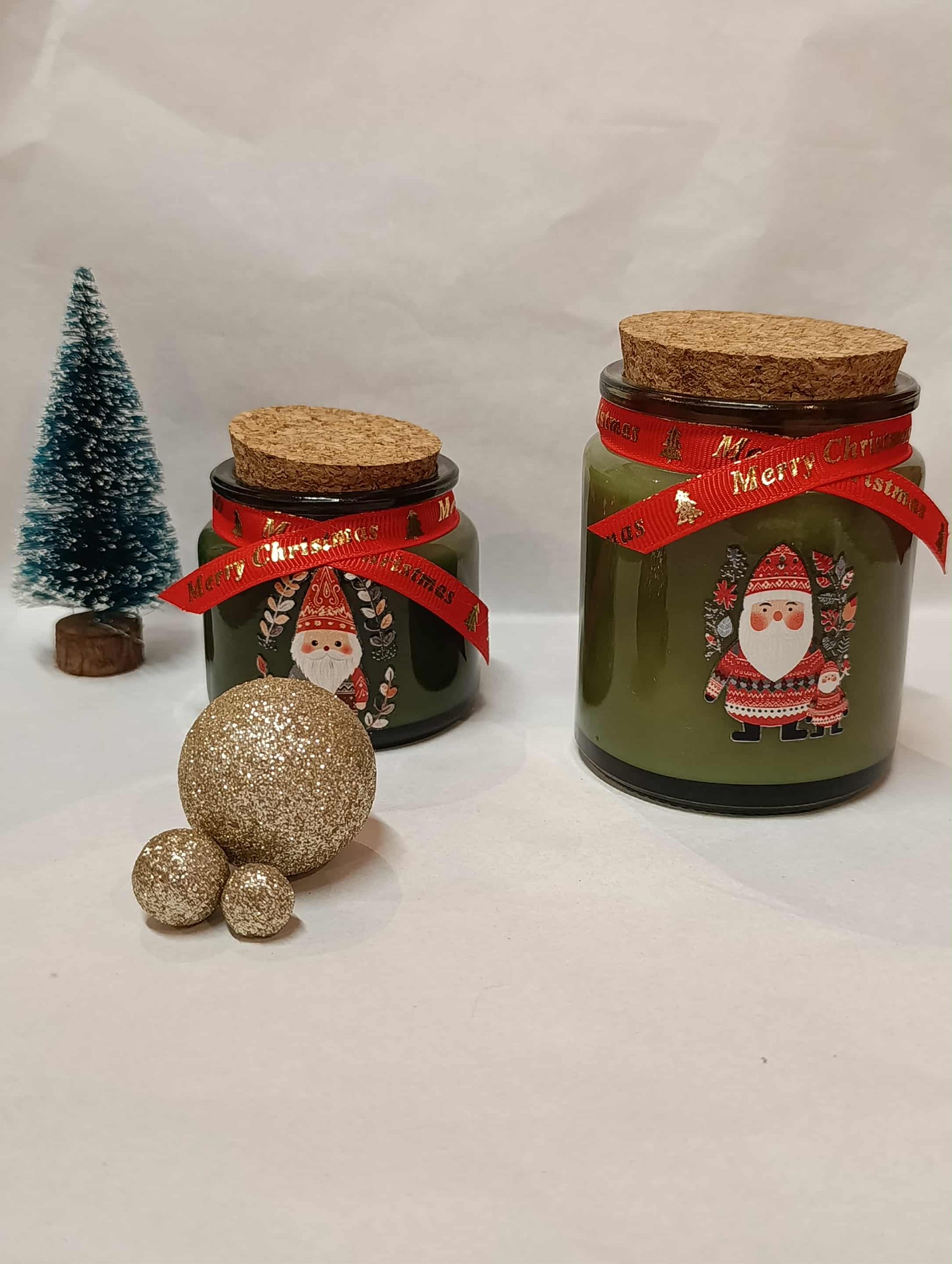 Φυτικό κερί σόγιας σε άρωμα μελομακάρονο σε πράσινο γυάλινο βάζο και καπάκι φελλού διακοσμημένο με αυτοκόλλητο Άγιο βασίλη-νάνο τυχαίας επιλογής και κορδέλα κόκκινη ή πράσινη ”Merry Christmas στο πάνω μέρος!!