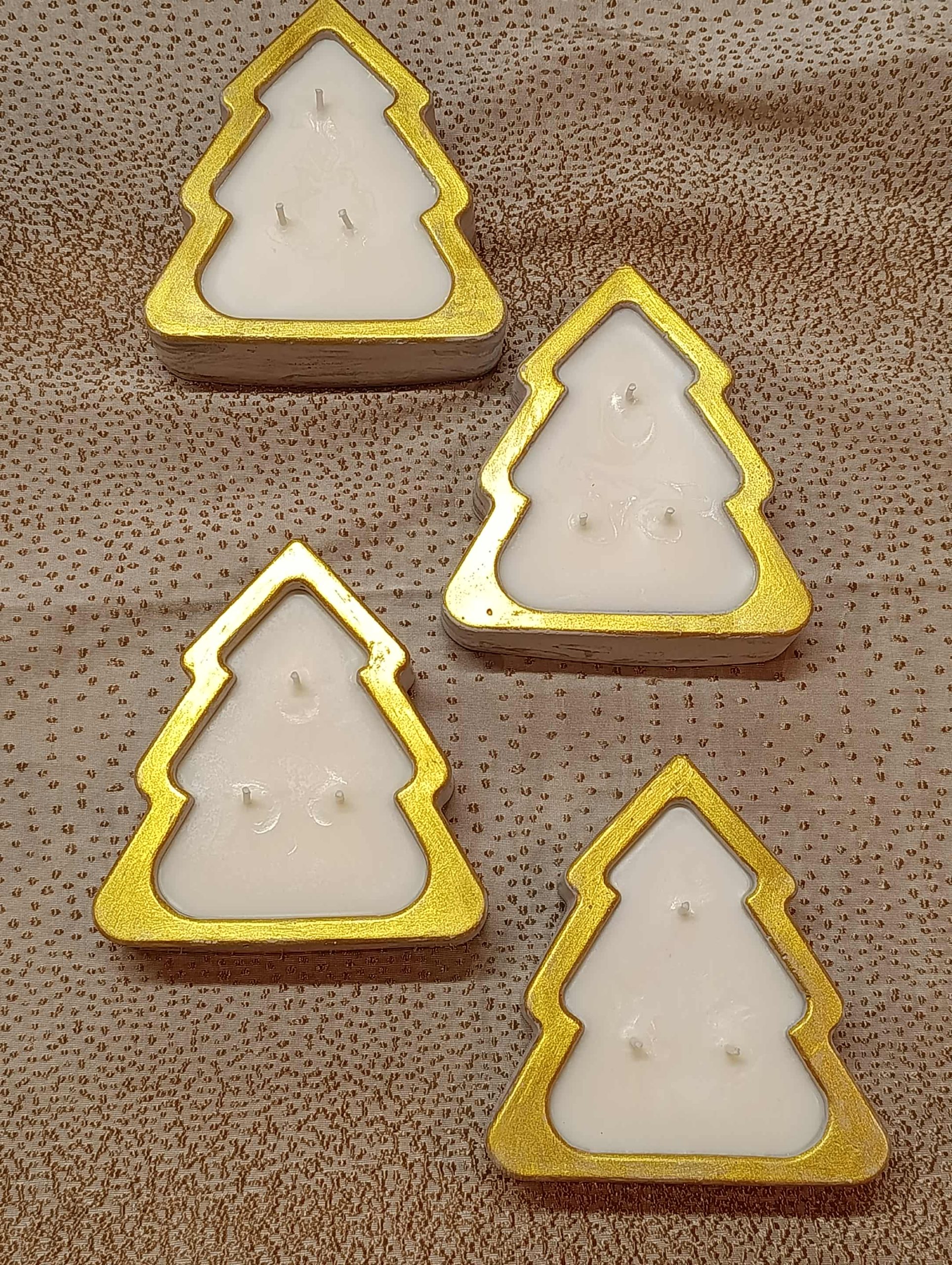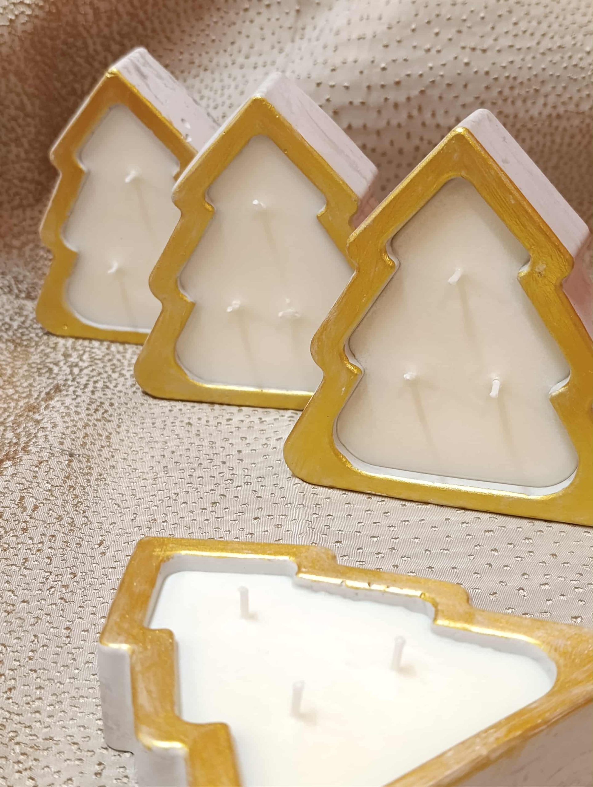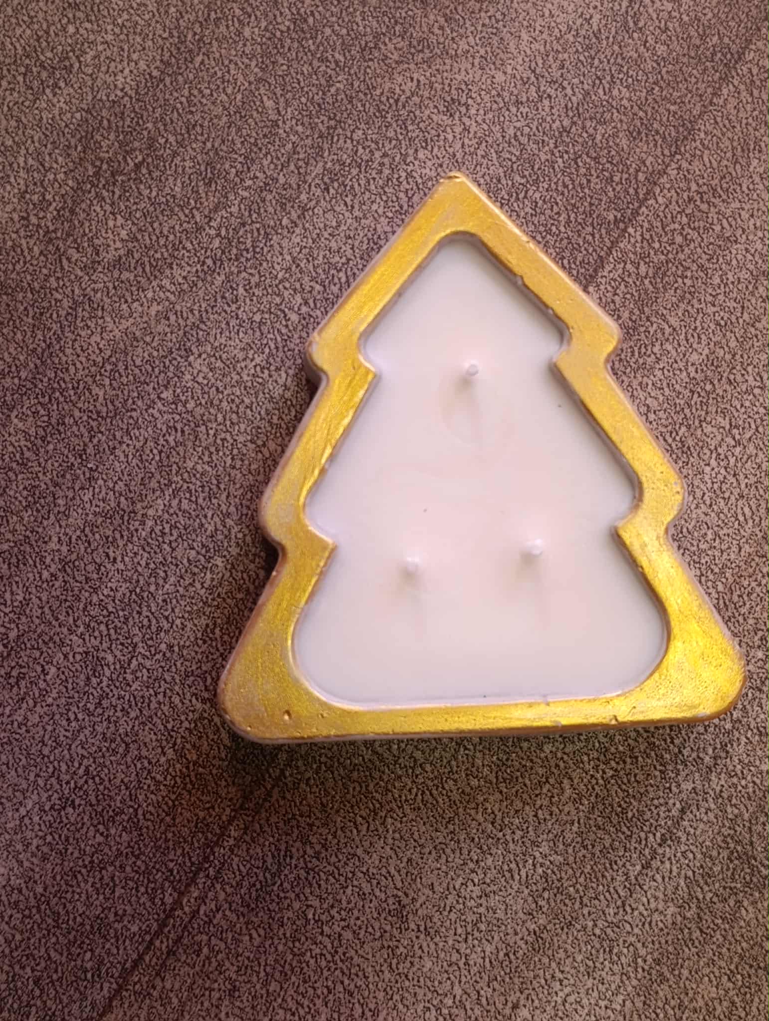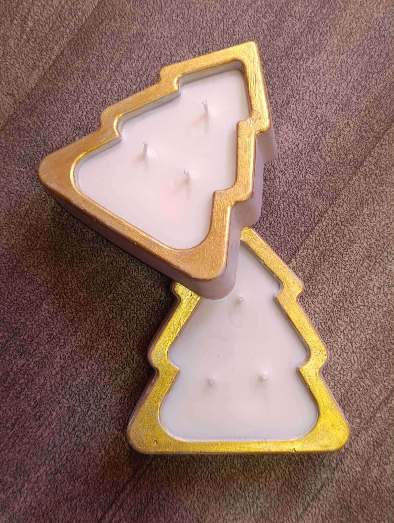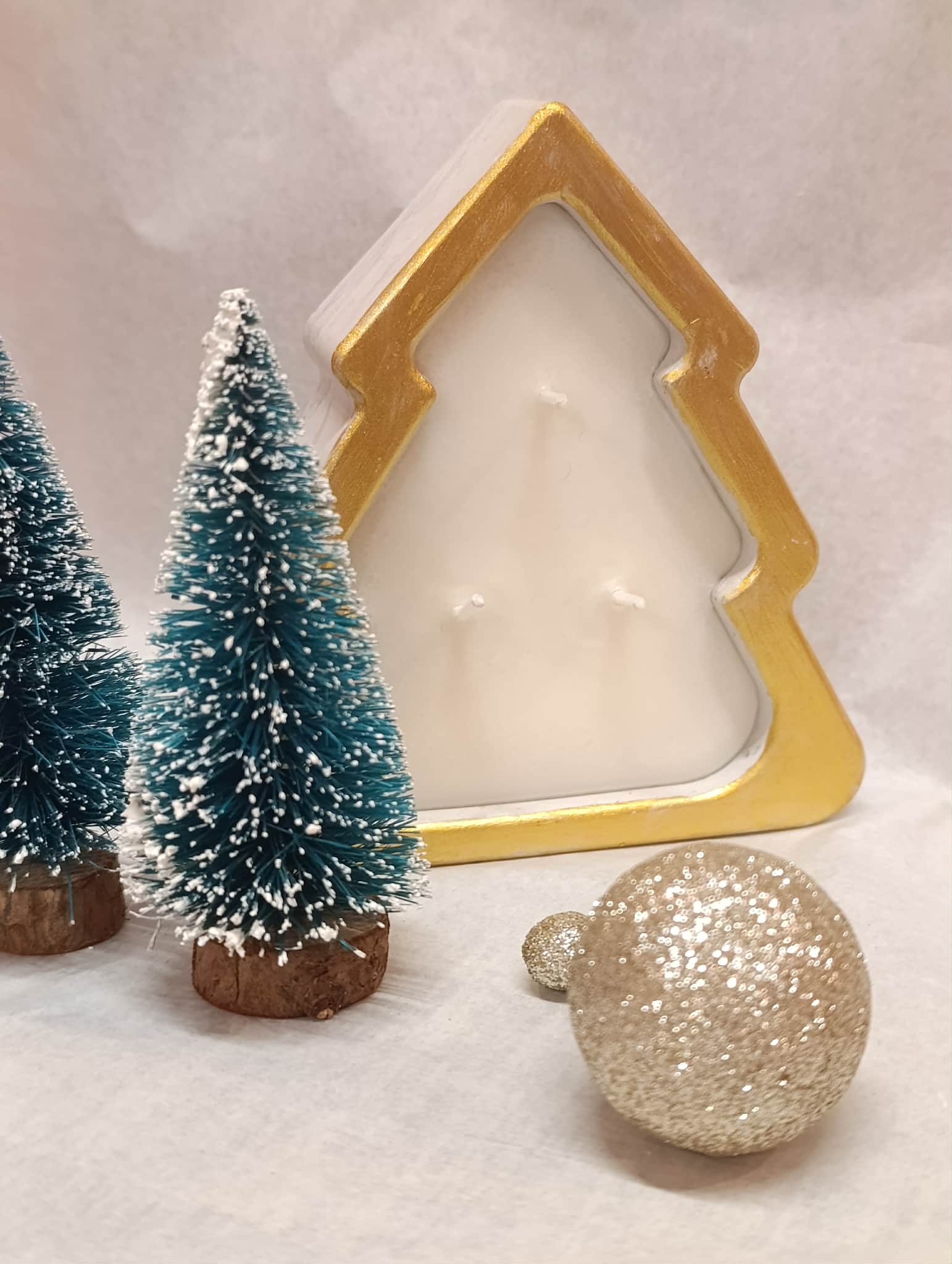 Χειροποίητο κεραμικό Χριστουγενιάτικο κερί σόγιας σε σχήμα δεντράκι με τρία φυτίλια και χρυσή λεπτομέρεια στο πάνω μέρος του κεραμικού !!
