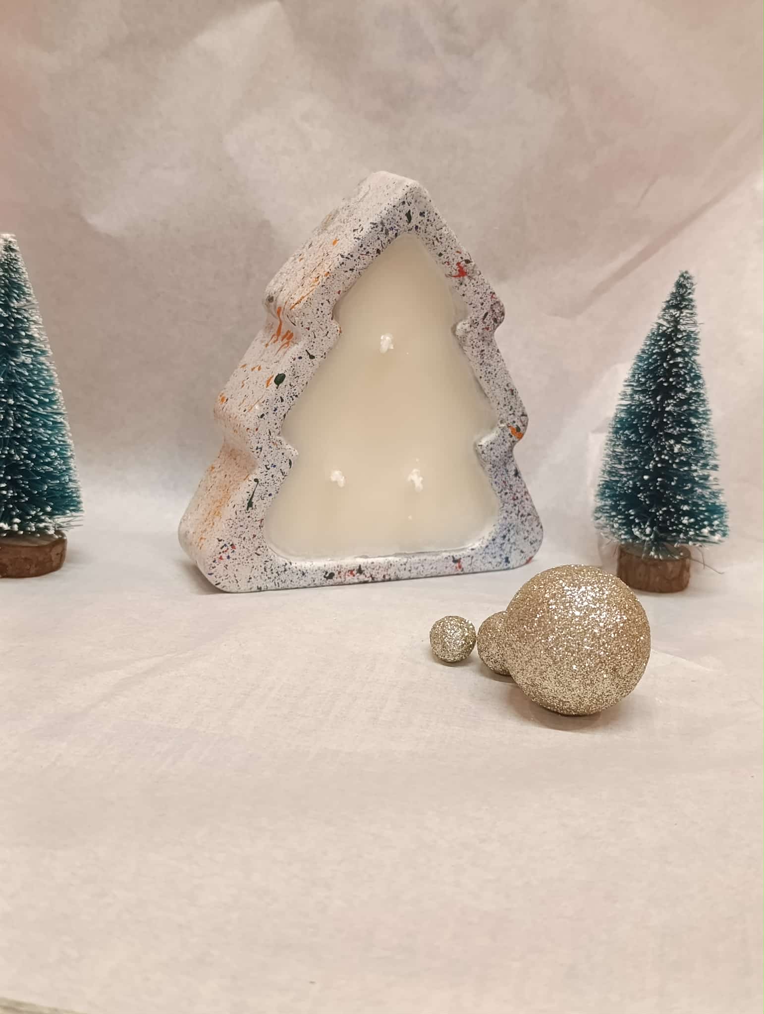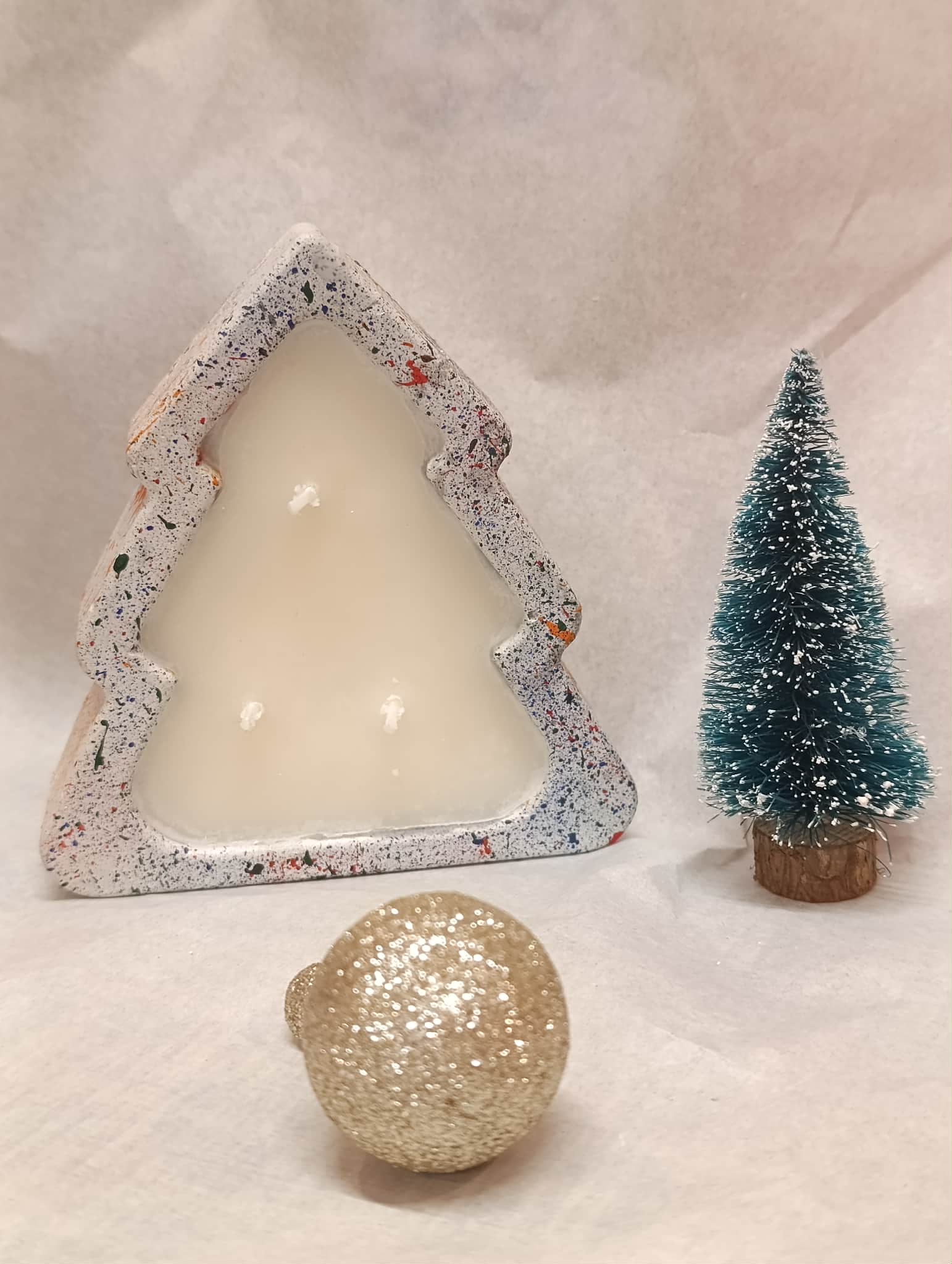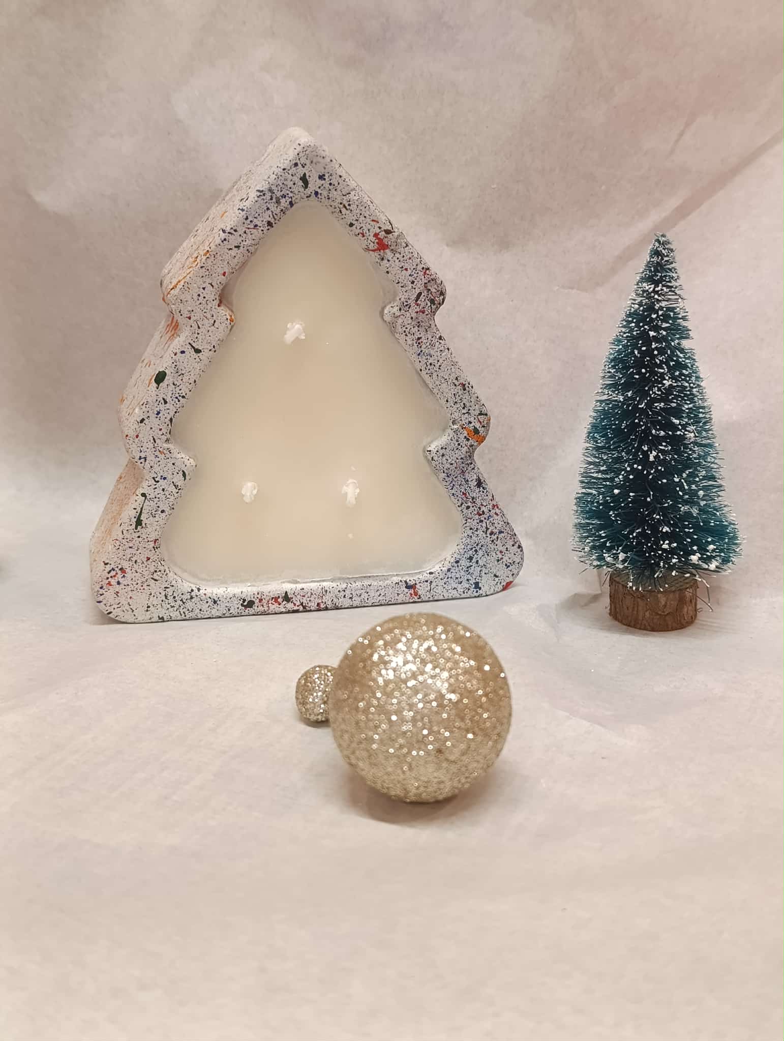 Χειροποίητο κεραμικό Χριστουγενιάτικο κερί σόγιας με άρωμα μελομακάρονο και σχήμα δεντράκι με τρία φυτίλια και spash σε διάφορα χρώματα στο εξωτερικό του κεραμικού !!