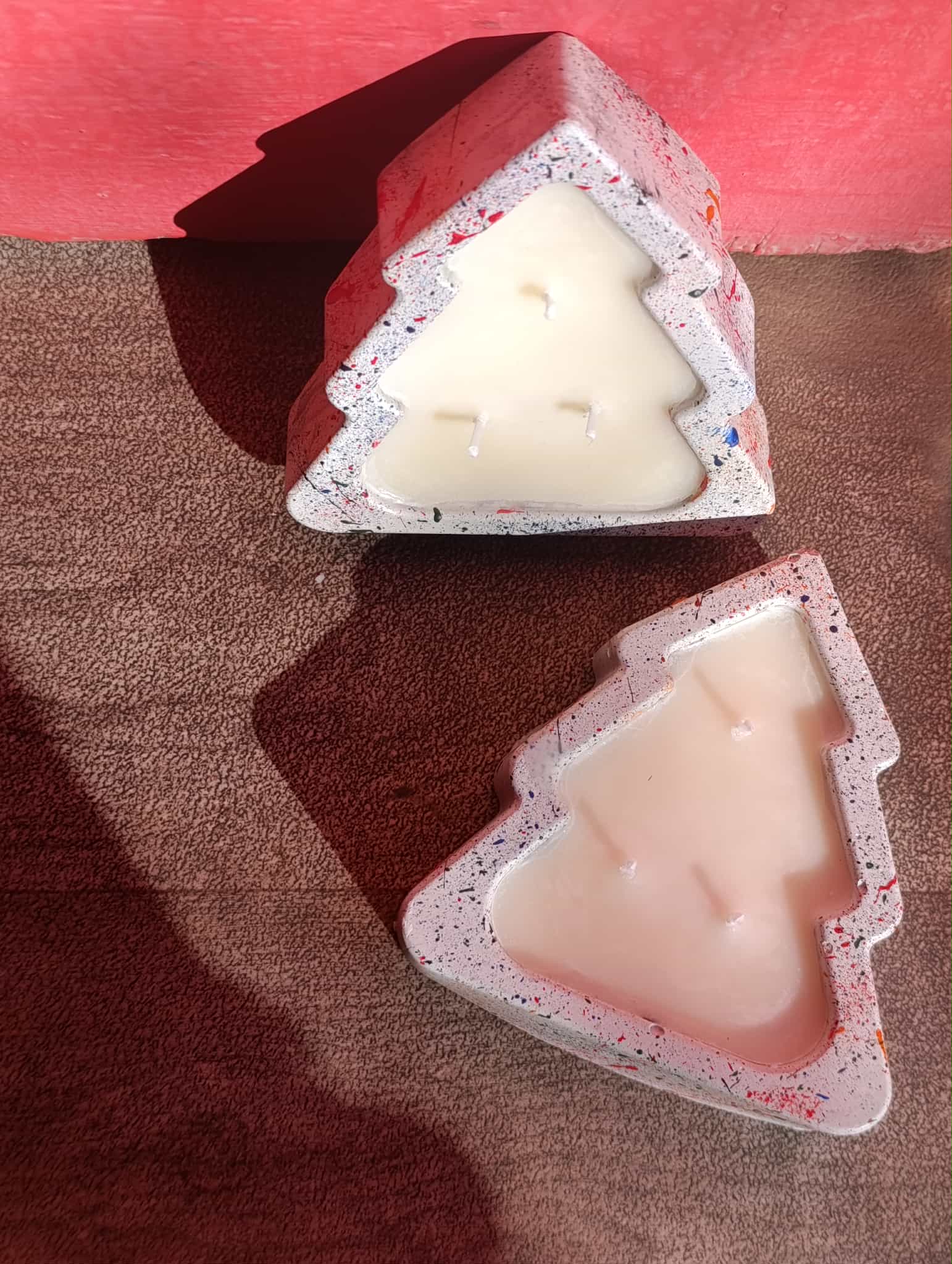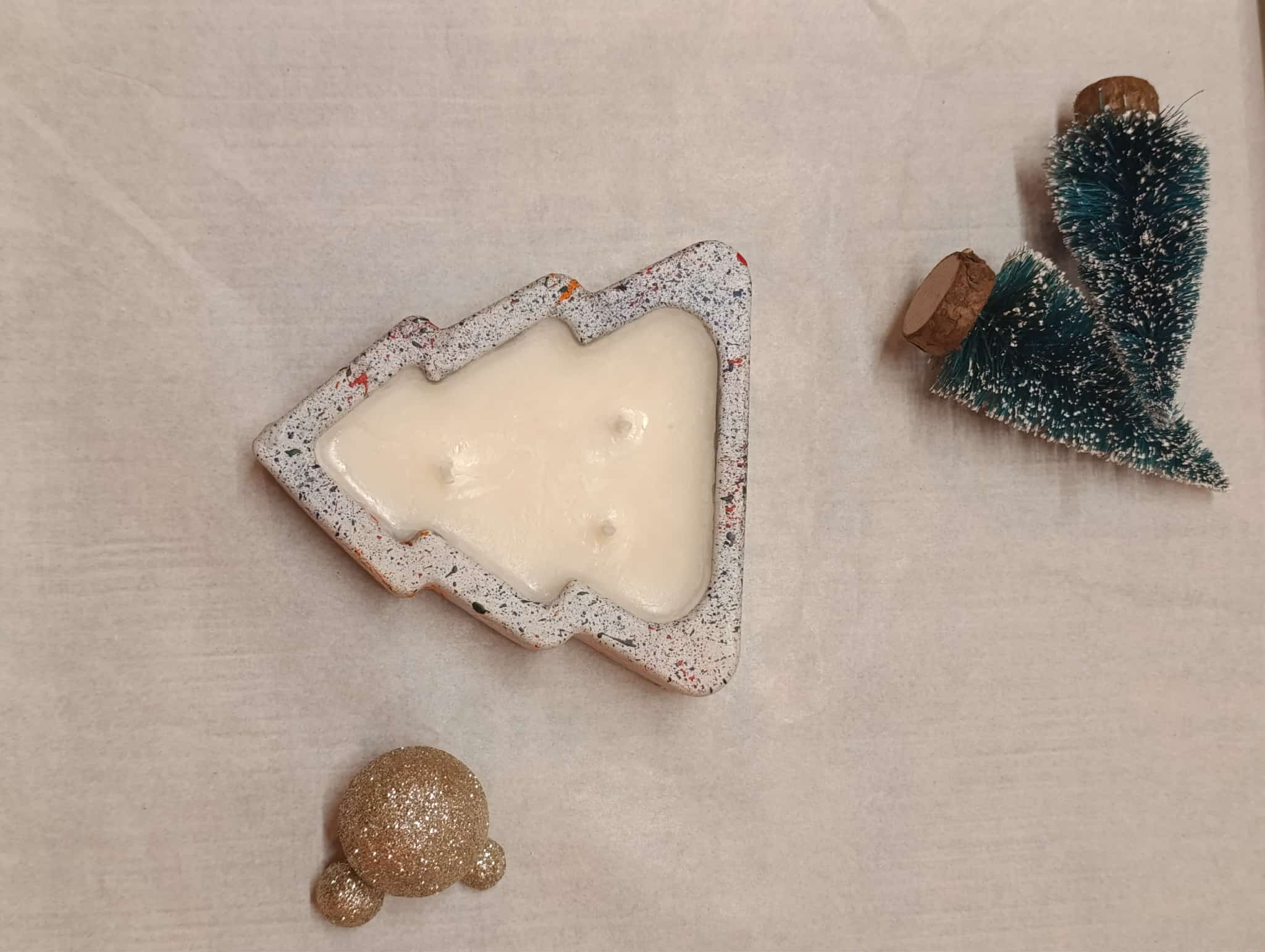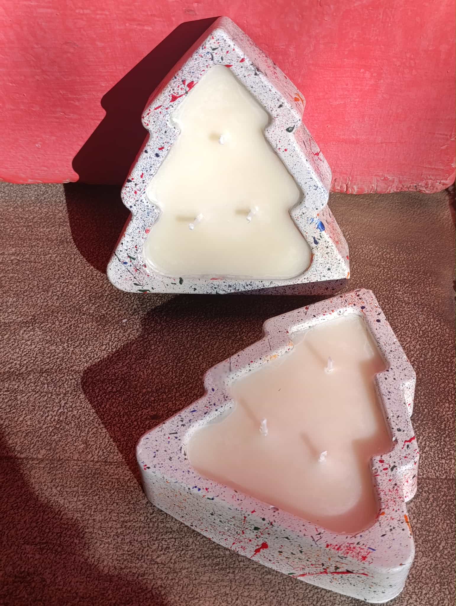 Χειροποίητο κεραμικό Χριστουγενιάτικο κερί σόγιας με άρωμα μελομακάρονο και σχήμα δεντράκι με τρία φυτίλια και spash σε διάφορα χρώματα στο εξωτερικό του κεραμικού !!