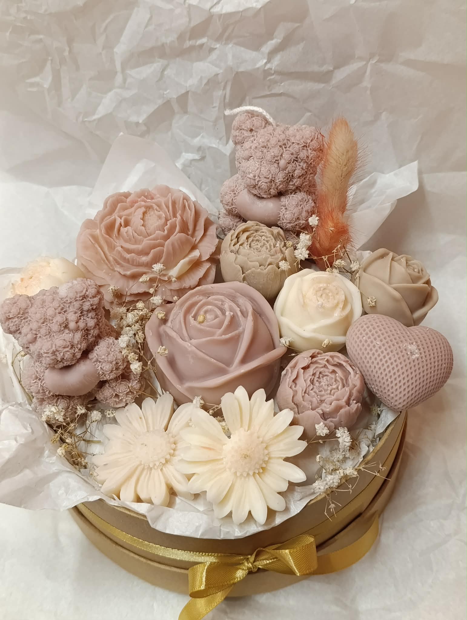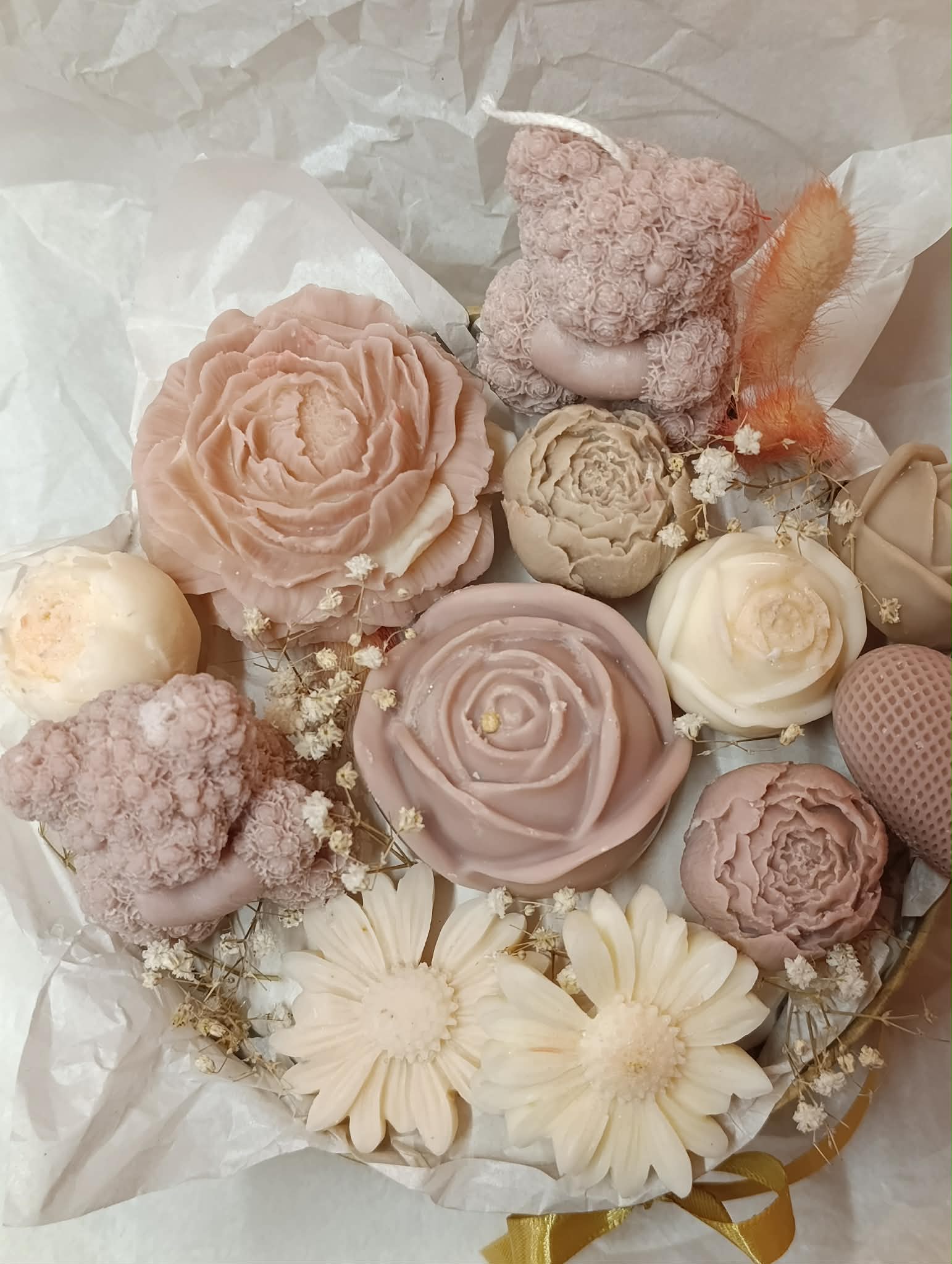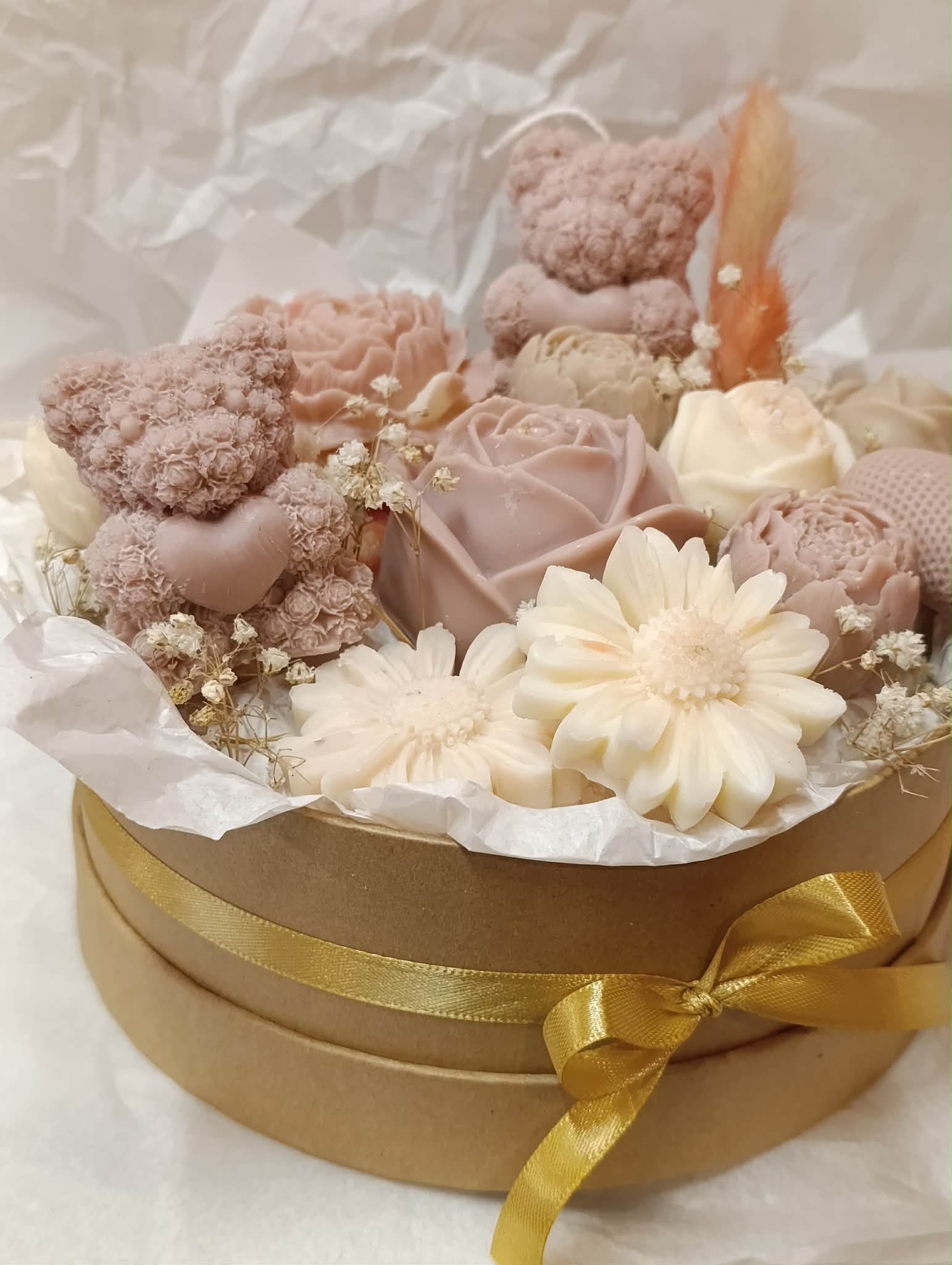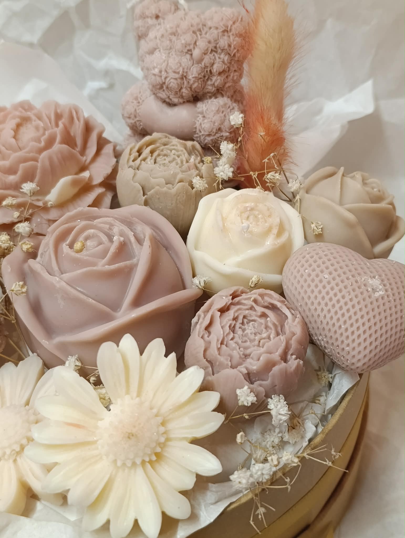 Μπουκέτο αρωματικών κεριών σε μπεζ και λευκές αποχρώσεις, με λουλούδια σε διαφορετικά μεγέθη, καρδούλα και αρκουδάκια σε μιξ αρώματα λουλουδιών και καθαριότητας!