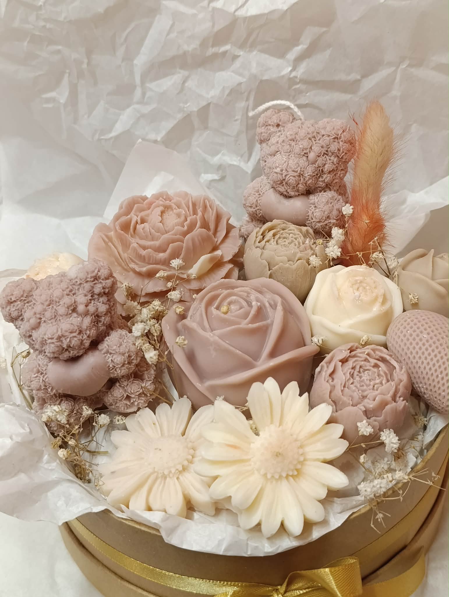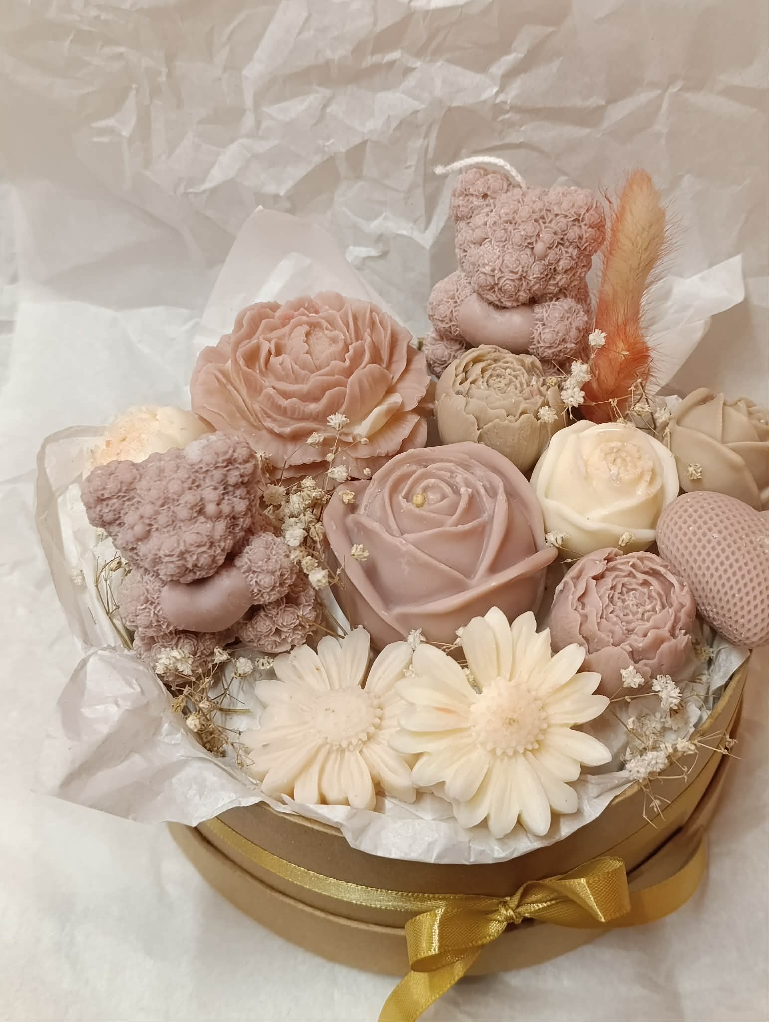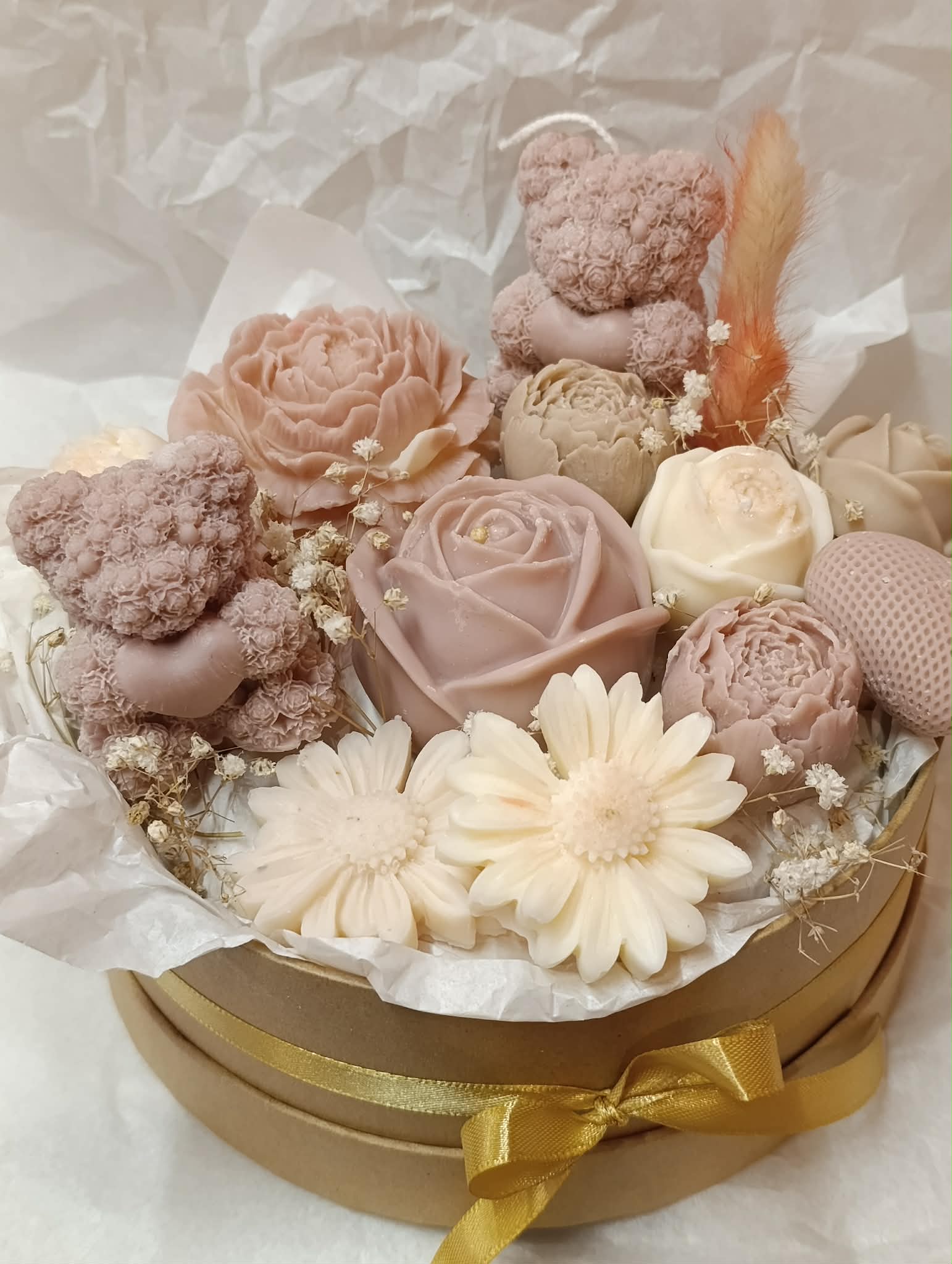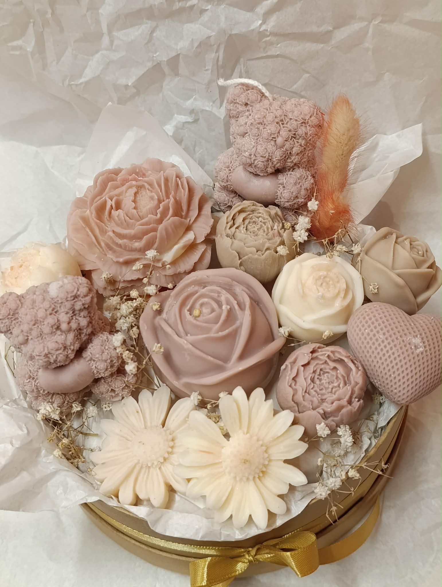 Μπουκέτο αρωματικών κεριών σε μπεζ και λευκές αποχρώσεις, με λουλούδια σε διαφορετικά μεγέθη, καρδούλα και αρκουδάκια σε μιξ αρώματα λουλουδιών και καθαριότητας!