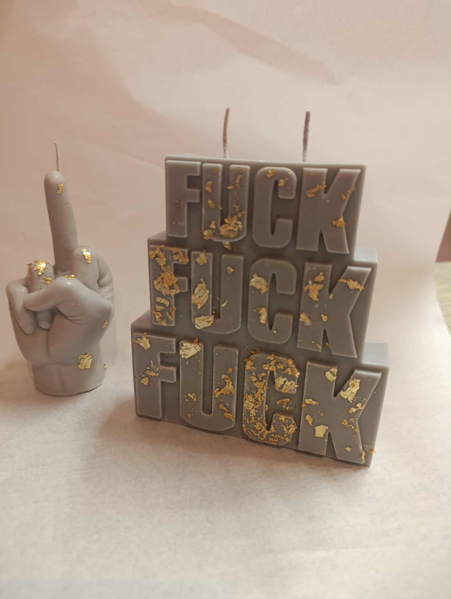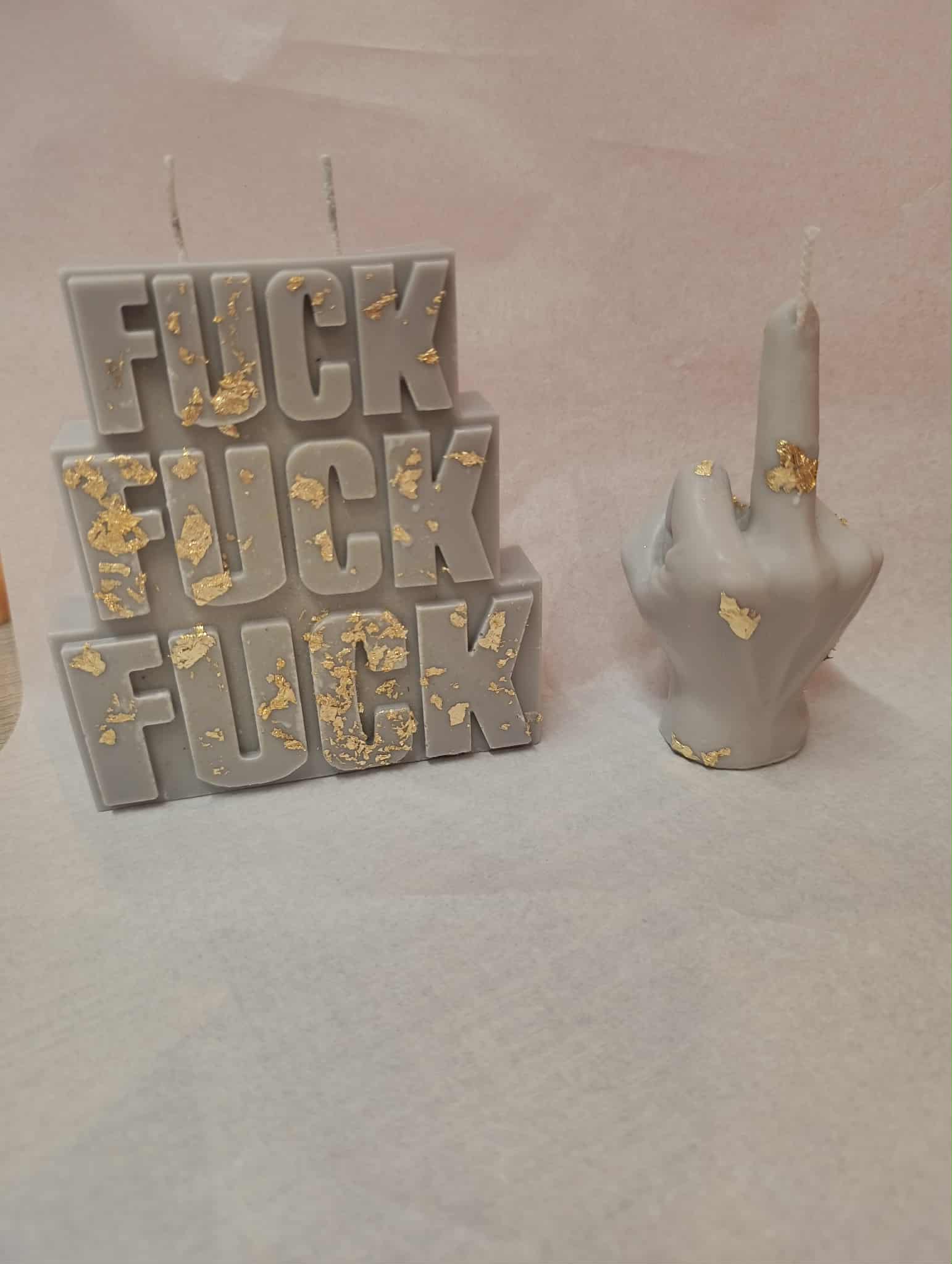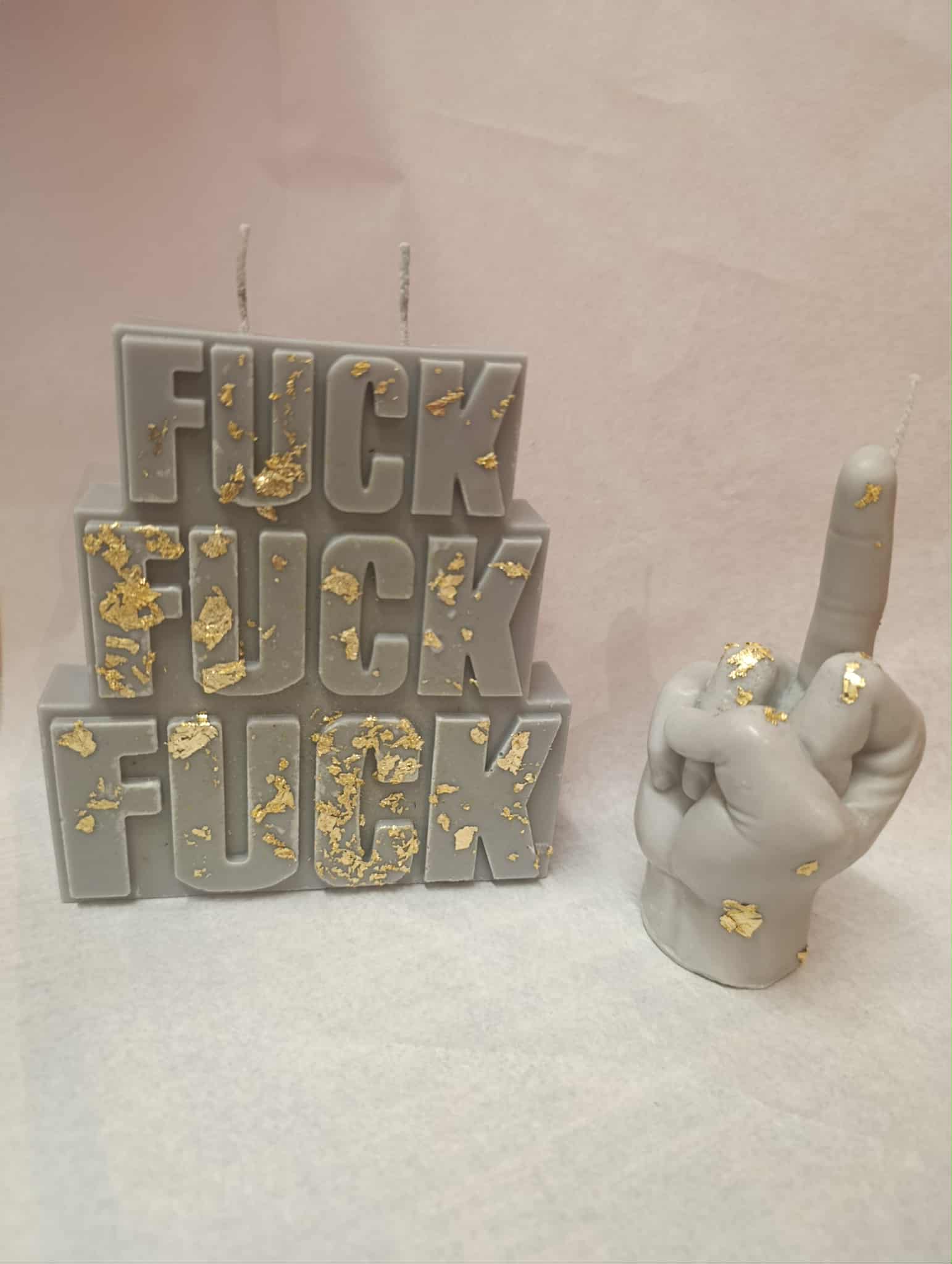 Set με φυτικά κεριά σόγιας-ελαιοκράμβης σε σχήμα χέρι-δάχτυλο χειρονομίας και πλακέτα με FUCK x3 σε μεγάλα μεγέθη διακοσμημένα με φύλλα χρυσού!!