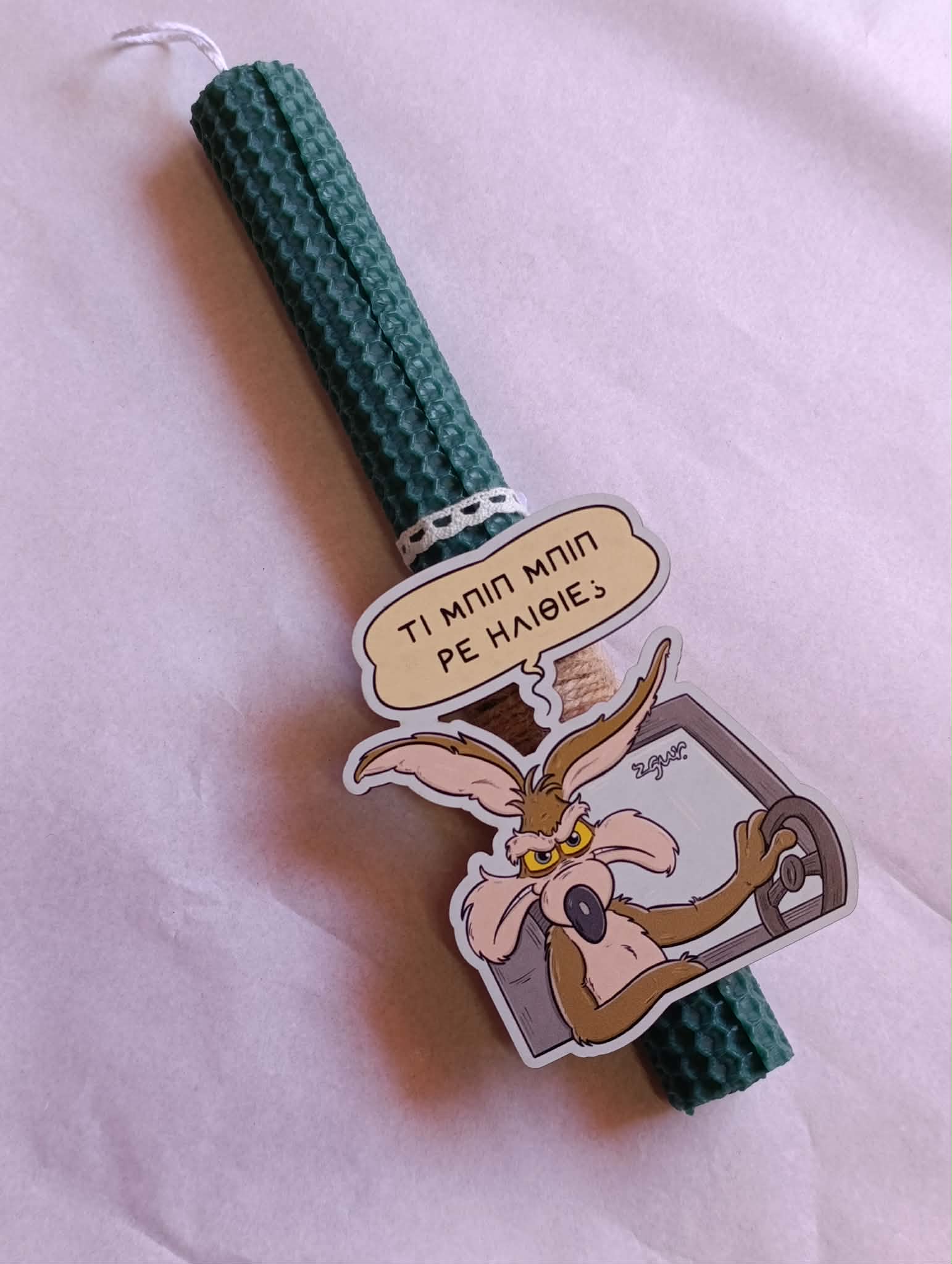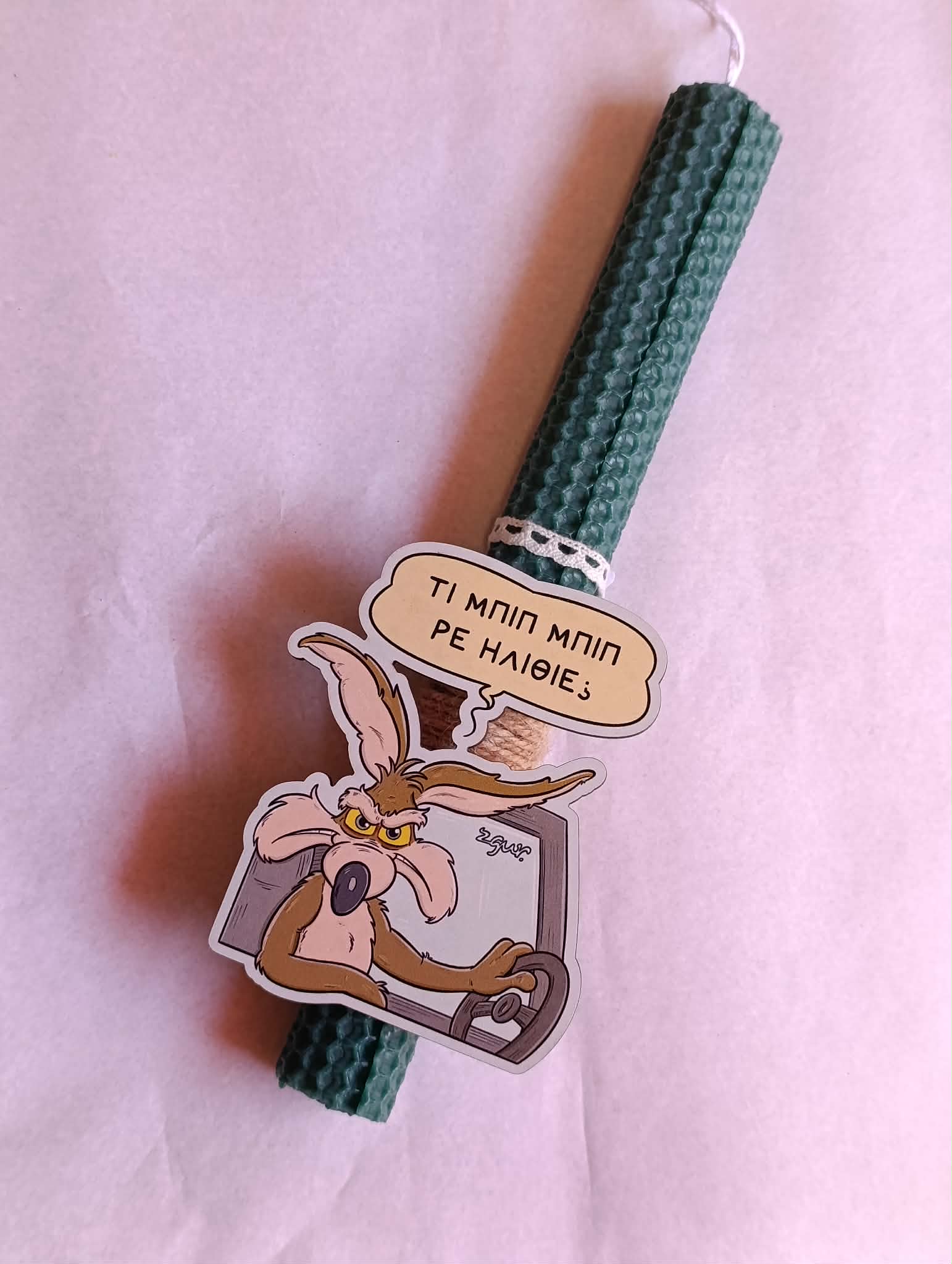 Αυτή η λαμπάδα σχεδιάστηκε αποκλειστικά για σένα (ή για τον φίλο σου που χρειάζεται σεμινάρια διαχείρισης θυμού στο τιμόνι). Το αγαπημένο μας Κογιότ σε μια στιγμή απόλυτης ειλικρίνειας: “Τι μπιπ μπιπ ρε ηλίθιε;”.