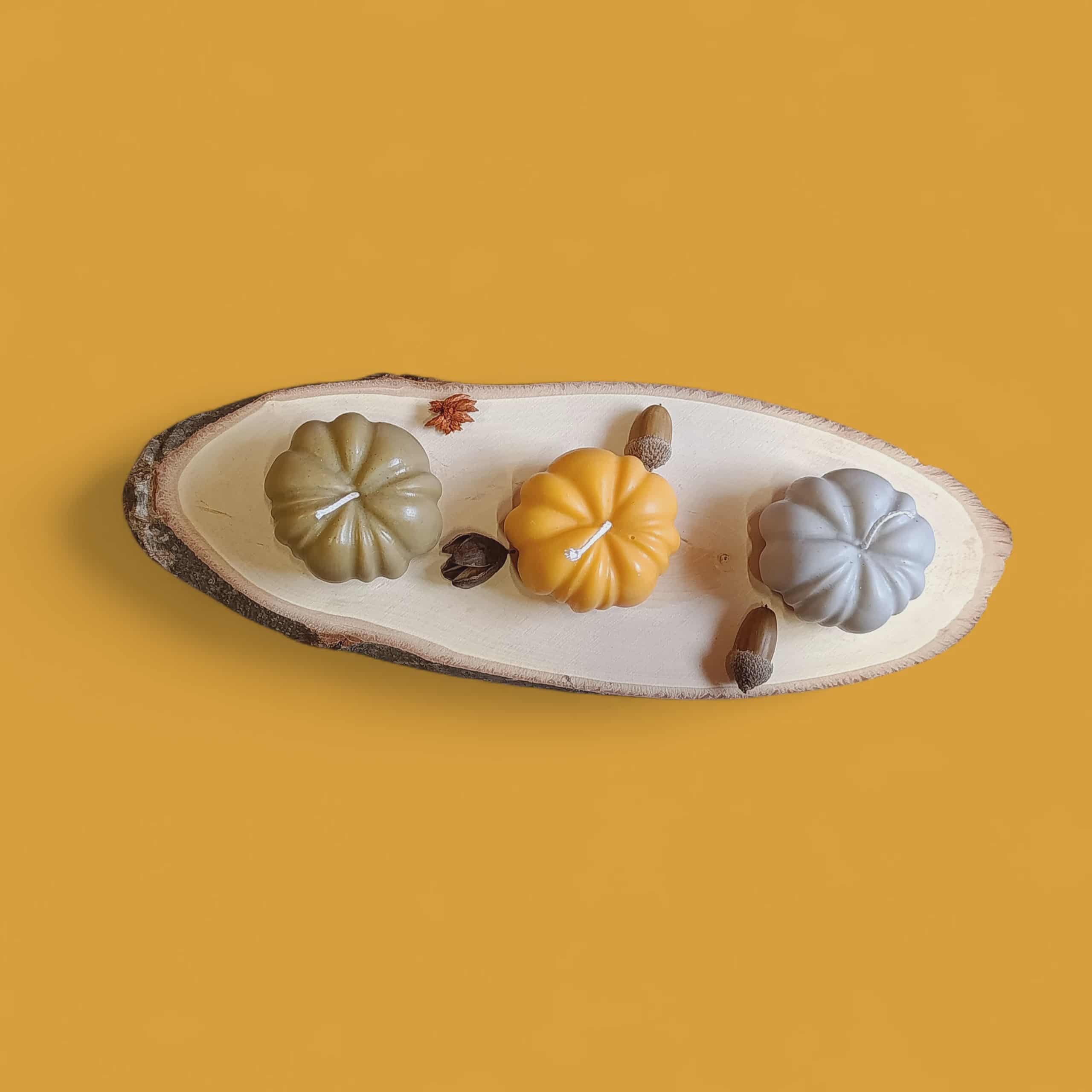 Στο σετ ΔΕΝ συμπεριλαμβάνεται η ξύλινη βάση, αποτελείται από τα τρία κεριά κολοκύθες,μια σε χρώμα πορτοκαλί, μια σε γκρι και μια σε χακί χρώμα!